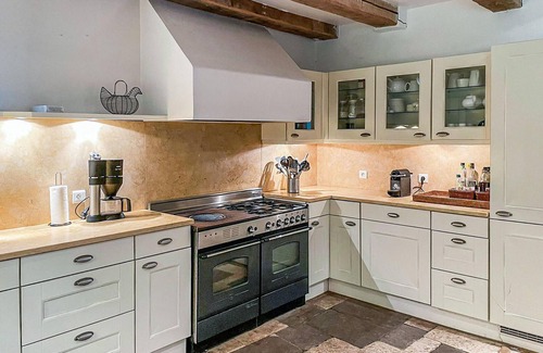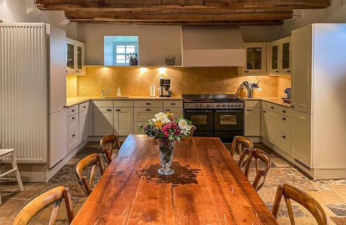 The house from the 19th century welcomes you in an idyllic location surrounded by beautiful nature. Spend a relaxing time out with your loved ones here. Old wooden ceilings, exposed brickwork and decorative wooden beams give the rooms of the attractive stone house its special charm of the historic manor house. Enjoy the rustic atmosphere at meals together at the long dining table. After an eventful day, make yourself comfortable on the inviting sofas and sit together chatting for a long time.