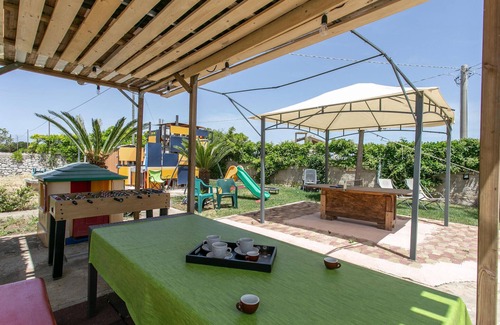 Villa Emma is a holiday home surrounded by the characteristic landscape of Modica in a flat area just a few kilometres from Cava Ispica (prehistoric archaeological site). It dominates the neighbourhood. The owner of the house is very child-orientated: he has equipped a special place in the house for children: in the garden there is a slide, swing, playhouse, trampoline and a small children's pool (4 m in diameter). In the house there is a table football for the entertainment of adults and children. In the large garden, together with the children's games, there are tables, chairs, parasols and a corner with a barbecue, ideal for al fresco dining. 5 bedrooms (3 of them with private bathroom) all with TV, fridge and air conditioning. The very spacious kitchen (approx. 30 m2) is equipped with every comfort (grill plate, induction hob, coffee machine). From the kitchen, access to the large equipped veranda (sitting area with stereo), sheltered by windows overlooking the garden.