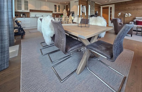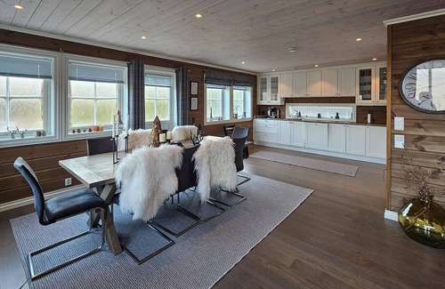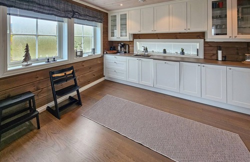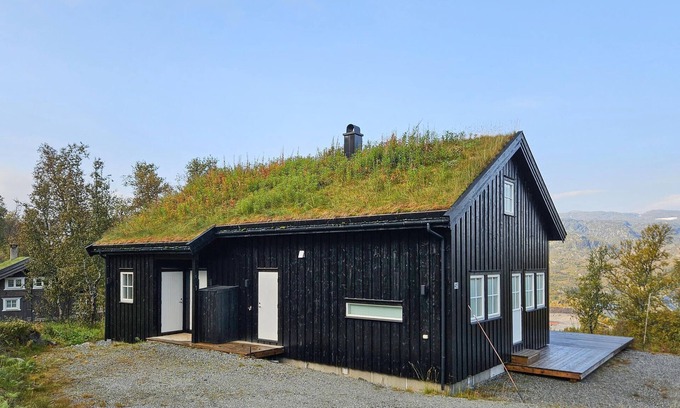 With space for a larger group, your holiday home near Lake Eivindbuvatn welcomes you to a relaxing holiday. The stylish wooden house with a natural roof not only offers you modern, cosy accommodation, but also beautiful views of the surrounding nature. Step inside and be welcomed by the warm and inviting atmosphere. In the morning, prepare a delicious breakfast for everyone in the large kitchen. The living room, furnished with a comfortable sofa area and a wood-burning stove, invites you to spend relaxing evenings with a glass of wine or a good book. Make yourself comfortable and enjoy the peace and security that this house offers. The holiday home also offers you a separate sofa area on the upper floor, ideal for film evenings or social gatherings. Spend cosy hours here with your family and enjoy the panoramic view of the beautiful landscape through the large windows.