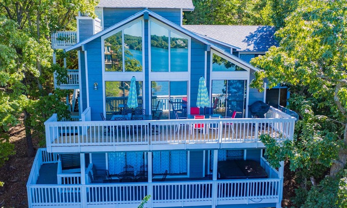 The size and layout of this home is not easy to explain, but trust me when I say it has more room than any other waterfront rental in Tan Tar A/Margaritaville. The large gathering areas (3 separate living rooms) and 2 complete kitchens really let you spread out and enjoy the Lake, the home has a great flow to it, is not just 5 bedrooms and a bunch of stairs. Each level is just a half flight of stairs down from the other, with one private 3 bed suite up by itself for privacy. Your lake view is truly mesmerizing, you will love watching the boats go by both night and day! The main level is walk in with no steps into the house for people with mobility issues.