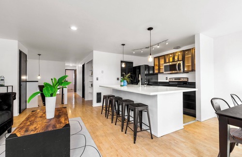 Our Spacious place has 5 bedrooms, 2 bathrooms, sleeps up to 10 guests. Split level designed entrance. Upstairs with open concept kitchen , dining and living areas including a large center island including dual sink and breakfast bar area. Adjacent to cozy dining and living area.