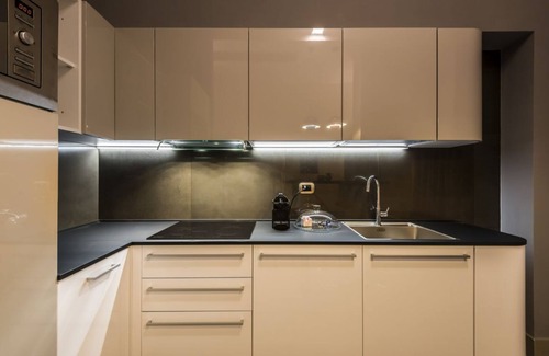 The kitchen is equipped with microwave oven, induction stove and capsule coffee machine.