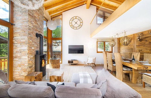 Sonneg Lodge (translated as Sunny Lodge because of its position in the Saas Fee village which enjoys much longer hours of natural sunlight than the lower village) is an architect designed luxury accommodation combining the charm and the warmth of a traditional Alpine Chalet with the best of contemporary modern design. Ideally situated within 100 meters from the central village car park, which allows easy access for the loading/unloading of luggage/ski equipment, it is also a short 5 minutes’ walk down to the heart of the village and dozens of restaurants which are scattered throughout the village, some just a few minutes’ walk away. The ski lifts are a pleasant 10 -15 minutes’ walk away or a very short ski-shuttle bus ride away (bus ride is free).Sonneg Chalet Penthouse is a stunning four /five bedroom duplex apartment (250 sq metres) with a large open plan double height reception room. Fitted out to the highest standards it is perhaps the best of its type to be found anywhere in Saas-Fee! Sonneg Penthouse features:• Four/Five bedrooms sleeping up to 8-10 persons• Four ( en-suite) bathrooms plus entrance hallway toile. Fiths bedroom is adjacient to another bedroom and is equipped with a sleeping couch. • Private entrance and staircase• Large private sauna with adjacent bathroom with bath and shower facilities• Four large private balconies.• Underfloor heating throughout plus log burning fireplace.• Large open plan double height reception room with a very large mezzanine area above providing additional seating and study area.• 60’ smart HD TV, Blue Ray DVD.• Full/fast Wi-Fi connection.• Washing machine and dryer.• Poggan Pohl kitchen with fully integrated Miele appliances.