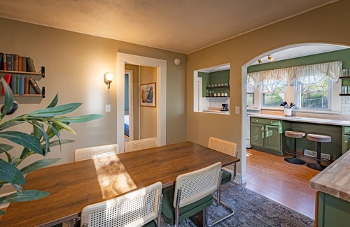 While there are some amazing dining options in town just mins away, our kitchen is fully stocked with all the essentials to cook a delicious meal for you and your loved ones. The kitchen counter has seating for 2 guests and the adjacent dining table has seating for 6 guests.