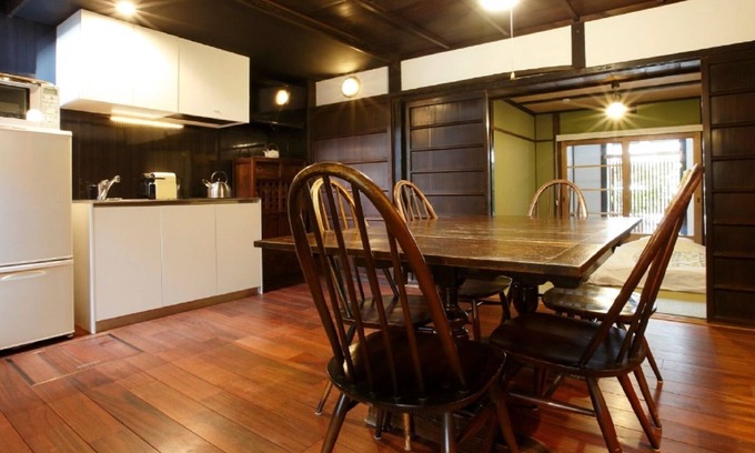 There are one tatami mats rooms where to sleep with futons, one bedroom with 2 single beds and a western style living room with table, chairs, sofa, modern kitchen, antique furniture, tub bath and shower, high-tech toilet, air conditioner, floor heating.