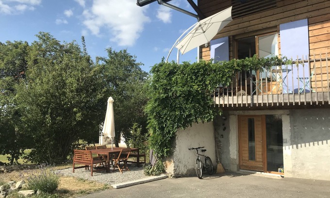 Modern, comfortable barn in a typical farmhouse in the heart of a traditional alpine hamlet. Spacious rooms with balcony, garden and magnificent view of the mountains and Lake Geneva. TV, wifi and fully equipped kitchen. The property is located between the mountains and the lake and only 5 minutes by car from Lake Geneva for swimming and Bernex / Thollon ski resorts. Portes des Soleil accessible resorts. Available all year round for walking, skiing, beach holidays. Close to Evian Les Bains and Thonon Les Bains.