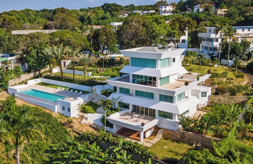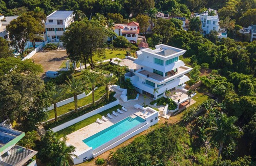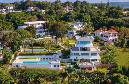 Perched on a hilltop overlooking the ocean, this luxurious 4-story villa feels like a private resort minutes from city life. Features panoramic ocean views, 5 bedrooms with AC and full bathrooms, and a stunning pool deck - your personal sunset viewing platform. Perfect for larger groups. Note: Multiple stairs between floors. Ideally located: 5 mins to Sosúa Beach, 7 mins to POP airport, 15 mins to Cabarete .