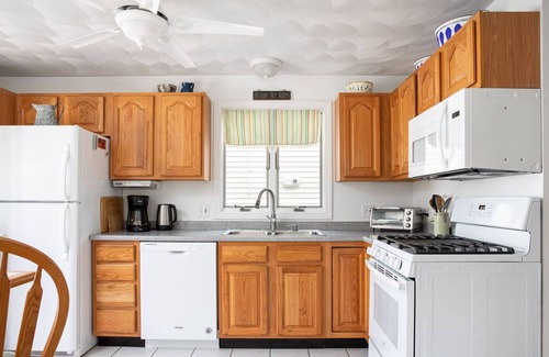 The spacious living room has a large flatscreen TV and generous seating for pizza and movie nights and includes bonus dining space. Up-to- date appliances and a well-equipped eat-in kitchen are great for both grab-and-go on your way to the beach as well as relaxed cook-at-home evenings after a full day at the beach.