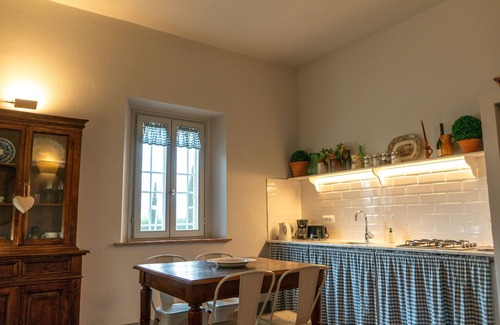 The apartment was built in 2022 by recovering warehouses and maintaining the original features. From the windows you can enjoy the view of the garden and the surrounding countryside with olive trees and cypresses. The outdoor space is very large. Inside 60 square meters with large living room / kitchen, large double bedroom and bedroom with 2 single beds (which can be joined).