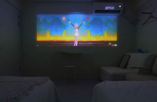 The middle room of the accommodation with a boiler control pad and a 120-inch beam projector