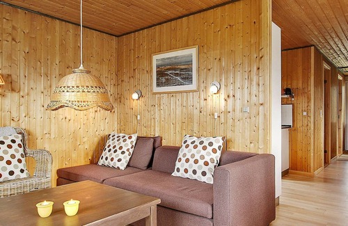 Layout: open kitchen(cooker(electric), hood, coffee machine, fridge-freezer), Living/bed room(TV(german television channels, danish TV channels (DR1 and TV2)), DVD player, CD player, stereo unit), bedroom(double bed), bedroom(2x single bed), bedroom(single bed), bathroom(bathtub or shower, washbasin, toilet), game computer, heating(electric), terrace, terrace(roofed), garden, air to air heatpump