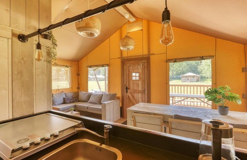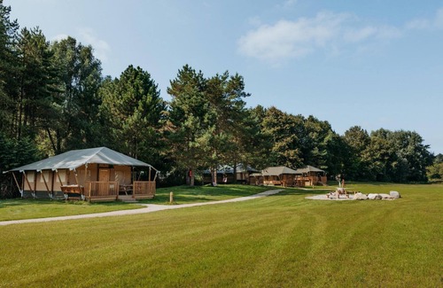 The GlampingThe Glamping is located in the middle of a forest on a large playing field with a swimming pool at its edge. The playing field is equipped with a sand-water device for toddlers, a football goal, volleyball net, several picnic tables ideal for an evening 'Green Egg' barbecue and last but not least, a campfire area! All our guests can reserve our own Eco-wellness for private use free of charge. A separate place where you can relax unseen and unclothed with the whole family in the sauna, hot tub and extra heated pool.