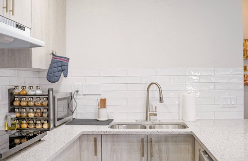 The open, spacious, and well-lit kitchen boasts a meticulously designed multifunctional U-shaped countertop that can meet all your family's cooking needs. Additionally, we provide a microwave, coffee machine, toaster, and other equipment for your convenience.