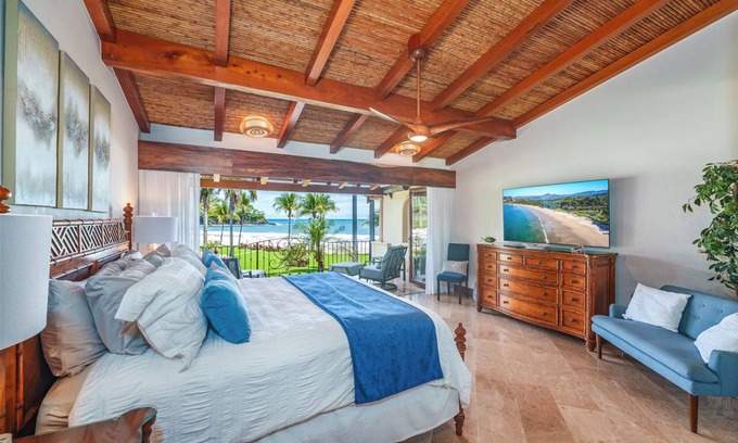 The extra large master bedroom is complete with the most comfortable king sized bed and extra large dresser and an 8 foot tall armoire. The view from this bedroom is exquisite featuring the perfect place to enjoy the ocean view by day and the sunset every evening (not all villas have this view!)