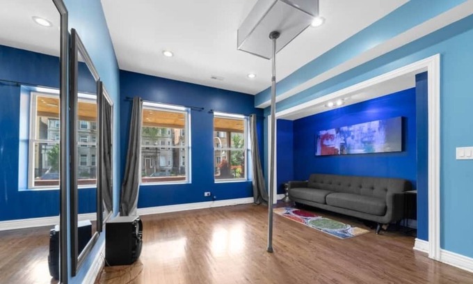 This is a 2 level unit where the sleeping area is on the top level and the bottom feature includes a larger open unit. This addition is so cool! You have booked a stay at the LUXRO and now you want to invite friends and family over! The 50 Shades Of Blue Suite, which has 3 sitting areas for gathering. Full Kitchen area, tv's for display purposes only, speaker system, dancer pole, card table room, and 1 bathroom. This is not for parties! If you have more guests than you care to have in your short term rental sleeping quarters, then this addition is to make your guests feel comfortable.