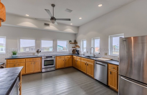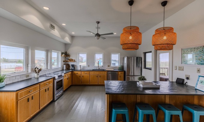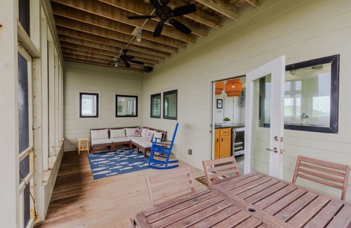 The first floor is a completely open floor plan, perfect for entertaining family and friends. The house is uncluttered and open, allowing for everyone to spread out and find their perfect spot to relax (Personally, I recommend the screen porch). You will enjoy 360 degree views of beach and bay. The house boasts a large modern kitchen with island seating. The kitchen is open to the dining and living areas. There is a large screened in porch off the kitchen with a dining table and couch. It truly is the perfect place to enjoy a morning coffee, listen to the ocean, and watch the pelicans fly over the house.