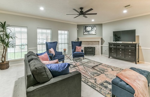 The 528 Estate is an executive style home located in Friendswood Texas. Private backyard pool + hot tub oasis! All four bedrooms are furnished with comfortable, yet stylish furniture. The master bedroom features a king sized bedroom suite & "smart" flatscreen TV. The grand kitchen is fully stocked with cookware & features stainless appliances including a double oven. Island seating plus a large formal dining table can easily accommodate a dozen people. Fast WIFI, Washer / Dryer & Gameroom!