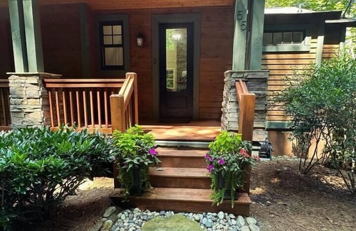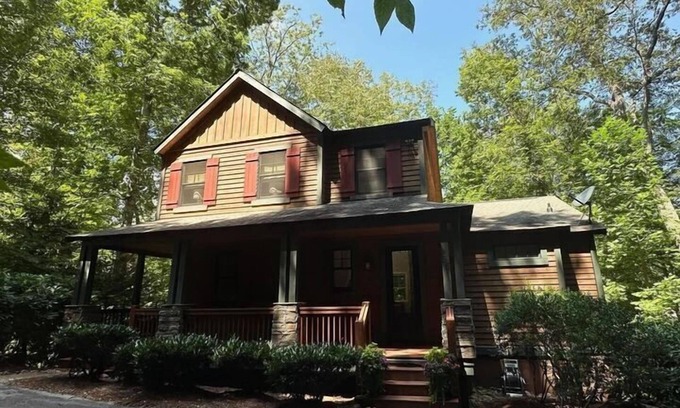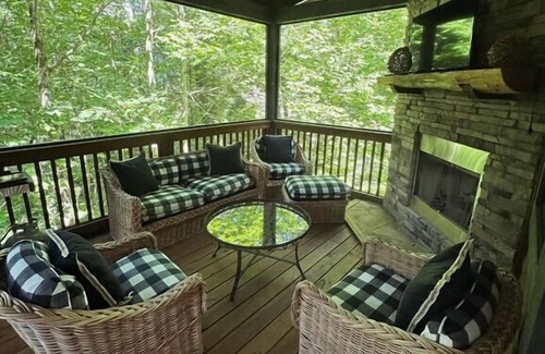 Upstairs you ll find two guest rooms with a queen bed. This home comfortably sleeps 6 guests. The home also features some fantastic outdoor spaces, including an exterior screened porch, an outdoor fireplace, and a grill with plenty of comfortable seating so guests may enjoy the cool mountain breeze. This home is not pet friendly.