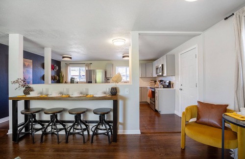⭒ Cook up a storm in our fully equipped kitchen, complete with modern appliances and a coffee station. The kitchen island offers bar seating and is adjacent to the dining area, making meal times a social highlight.