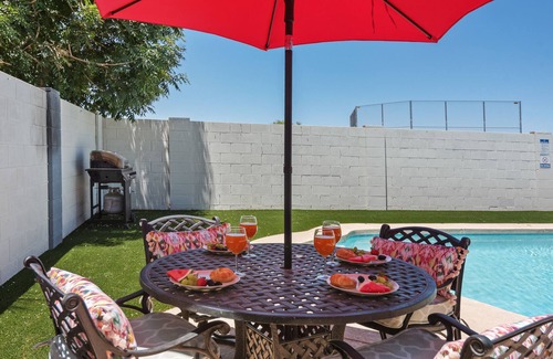 Enjoy group dining on this oversized dining table with seating for 10. Outside you will find a gas grill, patio dining table, and pool loungers to enjoy the Arizona sunshine.