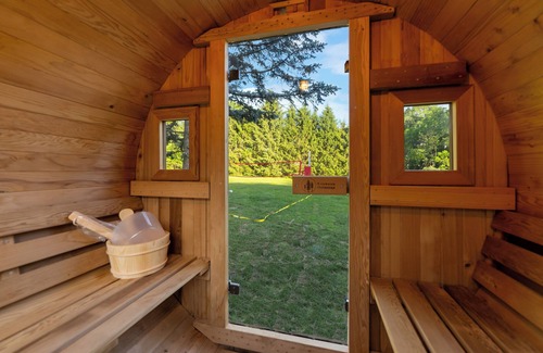 When it comes time to eat, serve up your meals in the elegant dining space right off the kitchen with a table set for ten (plus a 2-person breakfast bar). Or sit out on the deck and dine alfresco style while taking in the beautiful wooded views.