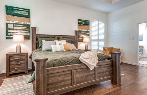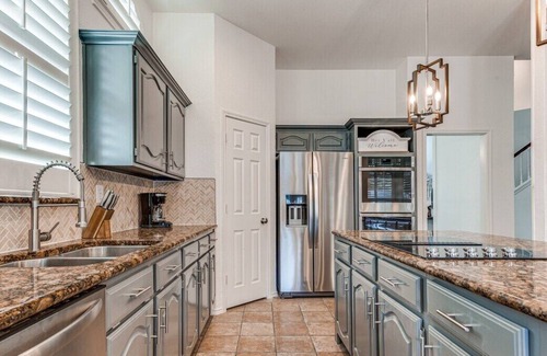 Welcome to our luxurious 4000 sqft home where you can spread out comfortably in the perfect getaway for your friends and family! Enjoy our custom movie theater with popcorn machine and high-end seating for your entire group. You will love our heated saltwater pool and outdoor dining under the covered patio. We feature separate kitchen/living/dining areas, memory foam mattresses and large smart TVs throughout the house. You won't want to leave!