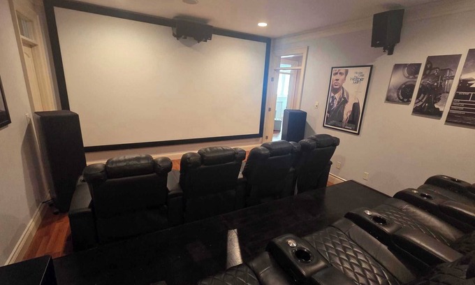Entertainment options abound. The private home theater features seven reclining seats, surround sound, and a massive screen for unforgettable movie nights or game-day events. A dedicated game room offers a pool table and pub-style seating, while the executive office provides a quiet escape. Throughout the house, a whole-home sound system adds the perfect soundtrack to your stay.