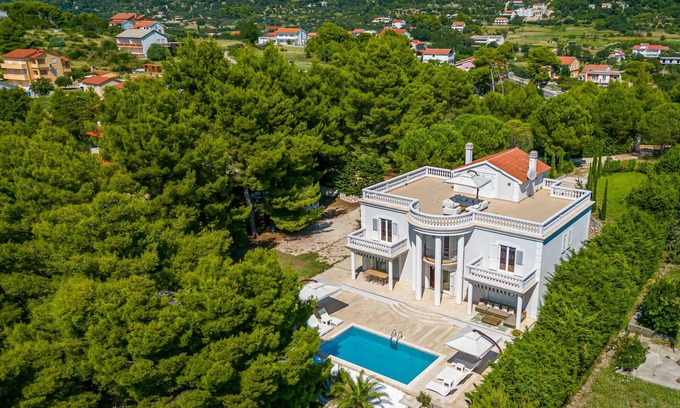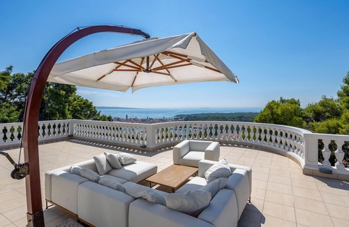 Enjoy a gorgeous sea panorama in this comfortable vacation home with pool and private tennis court.