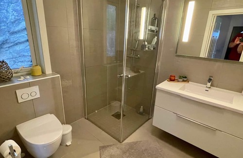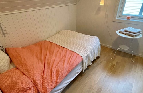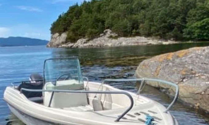 Lovely holiday home with a beautiful, quiet location. Great swimming conditions a few meters from the house and perfect for sport fishing. The holiday house is bright and pleasantly furnished over two floors. On the main floor, there is a nice entrance area to the open kitchen/living room. The kitchen has a large sliding door out to a partially covered terrace where you can have delicious dinners with the day's catch or just enjoy in the sun. Well equipped kitchen. Good internet capacity. On the main floor, there is a bathroom with shower, WC and washing machine. The first floor consists of 4 bedrooms and a bathroom with shower and WC. By the house, there is possible to fillet fish. The boat is to be ordered together with the holiday home. Fiberglass boat with 50 HP, perfectly suitable for fishing trips in the Bjoafjord. Petrol station for refilling only a few hundred meters away, so not a lot of carrying of cans.