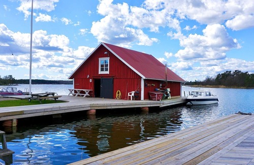 Summer idyll on a wonderful island in the Västervik Archipelago where you can enjoy a refreshing swim from the jetty or the beach just 40m away. Here you can experience genuine Swedish summer feeling at its best. Eknö is a large island where you can enjoy forests, open landscapes, the sea and wonderful hiking trails and swimming spots. Here you live in the western part of Eknö. The house is divided into two newly renovated fresh apartments that you have at your disposal. The accommodation is therefore perfect for groups who want to celebrate holidays together but still be able to have their own apartment. In the apartment on the ground floor there is a kitchen with dining area, dishwasher and a beautiful wood-burning stove that you can burn in (firewood included). There is a bedroom with two single beds and a single bed in the living room. In the apartment on the upper floor there is a kitchen with dining area and dishwasher. In the living room with sofa bed you have a magical view of the sea. There are two bedrooms here, one with two single beds and one with a single bed. The bathroom is right below the stairs, which makes it easy to reach from both apartments. Here there is a sink, shower and electric toilet. You have a newly built terrace with outdoor furniture and barbecue. You are greeted by a welcoming atmosphere where you are free to use both the shared wood-burning sauna with sea view in the boat house and the shared outdoor furniture with barbecue area. There is also a lounge area with a long table where you can open the large doors to the sea and really enjoy the magical view. Here you can enjoy fantastic fishing and you have a table with knives so you can fillet the fish by the boathouse and a large freezer in the basement. A smoker to smoke the fish is also available. You park the car at the harbor in Östra Skälö. There is also a popular restaurant right by the sea. At the agreed time for check-in/check-out, you will be picked up at Östra Skälö for the approx. 8-minute long boat ride with a larger motorboat with a roof. Motorboats can be rented on site for those who want to explore the archipelago, get ashore or take a fishing trip. Archipelago Service also has trips to and from the island a few times per week. It is also possible to order more boat trips for extra compensation from the owner of the house. It is also fine to bring your own boat. The launch site is on Östra Skälö. Keep in mind that there are no shops on the island, so buy your own food. The water in the tap is mainly used for showering, cooking and washing up, but plenty of fresh drinking water can be obtained from the well some distance away.