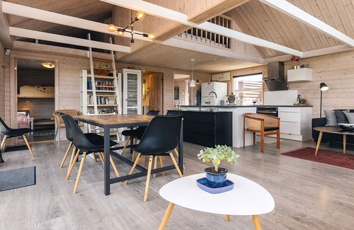Layout: Kitchen(stove(induction), coffee machine, oven, microwave, dishwasher, fridge-freezer), Living/bed room, bedroom(2x bunk bed), bedroom(double bed), bathroom(tumble dryer, washbasin, shower, toilet, washing machine), mezzanine(2x double folding bed), terrace, garden, garden furniture, sun loungers, geothermal energy, air to water heatpump