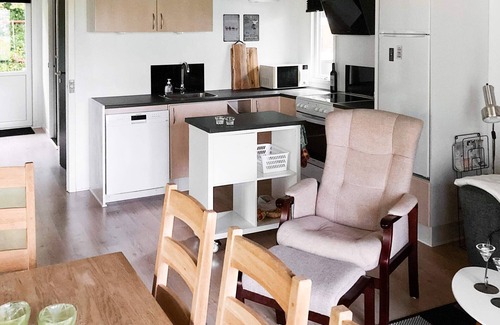 Layout: Living room(double folding bed, TV, chromecast, netflix), Kitchen(cooker(2 ring stoves), coffee machine, microwave, dishwasher, fridge(+ freezer)), bedroom(double bed), bedroom(double bed), bedroom(2x single bed), bathroom(floor heating)(washbasin, shower, toilet), heating(electric), garden, air to air heatpump