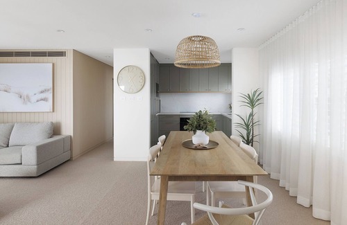 Neutral with coastal panelling and featuring an abundance of natural light, the contemporary open plan living and dining area with pure wool carpeting, has ducted air conditioning, a ceiling fan and smart TV.