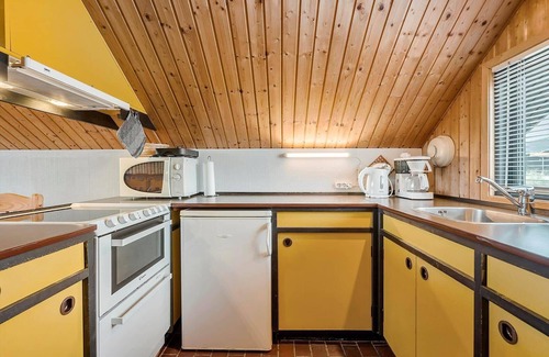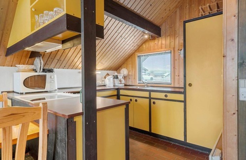 This charming holiday apartment at Bjerregård Strand offers a delightful escape for relaxation and enjoyment. The interior exudes classic Danish holiday home charm, featuring a spacious living room with high ceilings, wooden paneling, and rustic beams, creating an inviting atmosphere. The open U-shaped kitchen is well-equipped with modern amenities, including a combined electric/gas stove, a small dishwasher, a microwave, and a coffee maker, ensuring convenience for every culinary need.