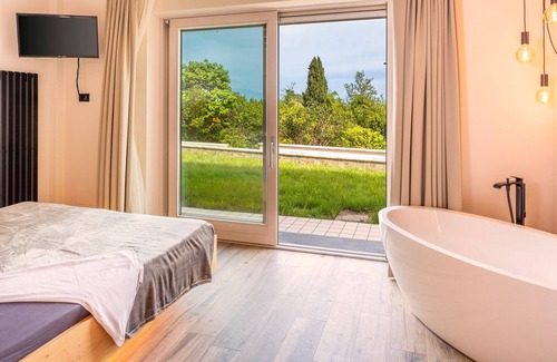 Elegant villa with a private garden, air conditioning, a communal pool, and views of Lake Garda, featuring three bedrooms and three bathrooms accommodating up to seven people.