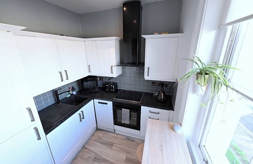 The kitchen has a fridge, a hob, an oven, a toaster, a kettle, a dishwasher, a freezer and a microwave.