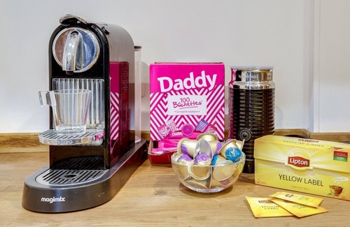 - Open-plan kitchen fully equipped with coffee, sugar and tea capsules