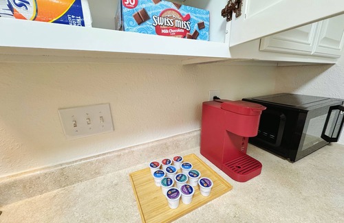 There is a fully equipped kitchen adjoined to the open living space where you can enjoy food with your friends and family. The kitchen is well stocked with all the basics to prepare a meal. Pots/pans, and a variety of dishware from glassware to plastic and paper. You will find a variety of Keurig pods.