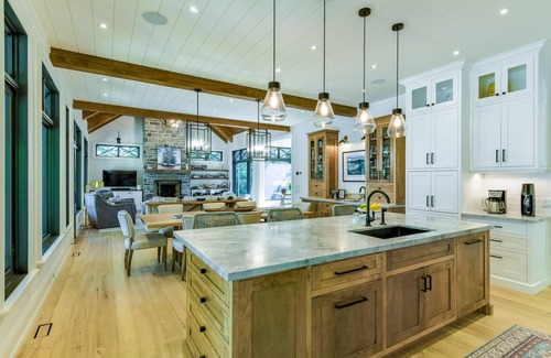 On the other side of the kitchen, a fully screened Muskoka Room features a wood-burning fireplace scaling the back wall. Beneath stunning timber beams, a wicker sofa and 2 matching armchairs encircle the fireplace. A second table with 4 chairs and bench offer an alternative location to enjoy your dinner! Walkout to either the back patio or front yard.