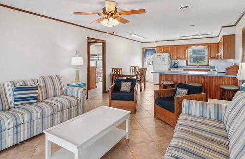 Main Level: Living Area w/Smart TV; Dining Area; Kitchen w/Breakfast Bar; 2 Queen Bedrooms; Bedroom w/2 Twin Beds; Bedroom w/Pyramid Bunk; 2 Full Hallway Bathrooms. All bedrooms feature Smart TV.