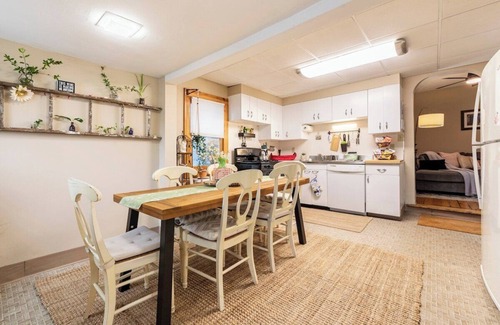 The second bedroom dubbed the "Ski Bunny Bunker," draws inspiration from nearby ski mountains and winter fun. With hardwood floors, a queen-size bed with a memory foam mattress, ample storage, and a TV with a Roku stick, it's a cozy and vibrant space.