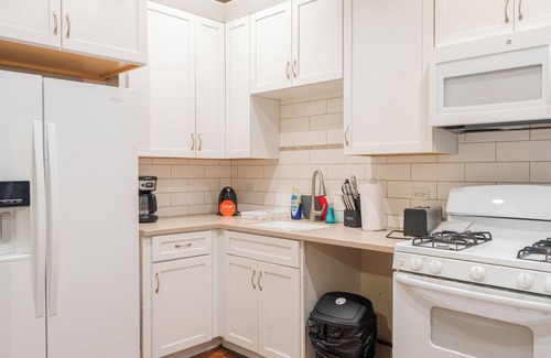 The chef-ready kitchen boasts granite counters, full cookware, and appliances like a fridge, gas range, oven, microwave, toaster, and coffee maker—perfect for whipping up meals or keeping that deep-dish pizza fresh!