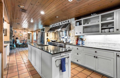The spacious gourmet kitchen and café table for coffee is situated in front of yet another gorgeous old stone fireplace. Fully equipped, the kitchen is a chef’s dream with rich countertops and stainless steel appliances, with barstool seating at the island for 3. The elegant dining room, with its own fireplace, provides a grand table with seating for twelve.