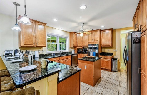 This 7-bedroom, 4.5-bathroom retreat comfortably sleeps 19 and provides privacy across three levels: