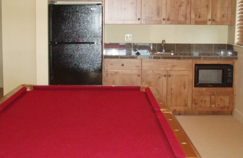 Visible: hot tub with amazing view, extra kitchenette, pool table, ping pong, shuffleboard, beautiful lodge furnishings