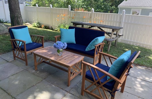 This property is fantastic for children or those seeking privacy as 3/4 of the property is fenced in. You'll find two patios with outdoor dining, a weber grill, a picnic table, a teak patio set on which you can relax for morning coffee, and an outdoor shower with hot and cold water to rinse off. Several beach chairs (6) and a beach stroller are available for your use in the basement which is accessible from stairs off the kitchen or through the bulkhead. Parking is available for two cars, but an 2 additional can park on the dirt road or parallel to the dirt road on the edge of the front lawn.