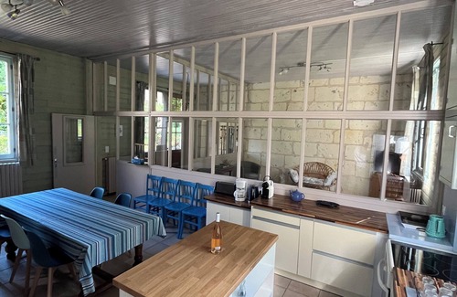 The cottage "THE CROW AND THE FOX 'welcomes you with its large glass door with its wisteria. This south facing house is located opposite the Big Island, offers a unique space to life with high ceilings disable input, lounge, kitchen-dining room: glass partitions, loft-style play with tufa stone walls or wood. 4 bedrooms with comfortable beds, one room on the ground floor 'the fox and the grapes' bed 180 wide and 120 bed.