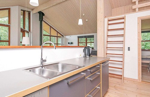 Holiday cottage with whirlpool. The cottage is built of the finest materials and located on a large natural plot close to one of Denmark's most beautiful golf courses, Hjarbæk Fjord Gofbane. The open kitchen has all modern amenities such as dishwasher, microwave oven and a 100 liter freezer. Large living room with wood-burning stove for a cool summer or autumn evening with rain and drizzle. A TV connected to satellite with German channels, DVD player and stereo with CD player. There are three bedrooms, two with double beds and one with two single beds. In addition, there are two beds on the mezzanine. Large open terrace where you can enjoy views of the scenic surroundings, while dinner is prepared on the garden grill. The children can safely romp on the plot.
