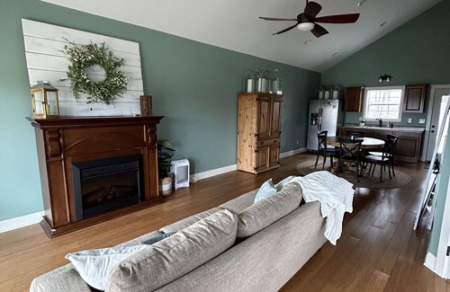 Welcome to Stone Creek Stables. Relax and unwind watching the beautiful sunsets from the front porch on this 80 acre private horse farm. Located just outside of Crestwood, ky , 30 minutes from Church Hill Downs, 25 minutes from Louisville Airport, 15 minutes from restaurants and shopping, and 10 minutes from Valhalla golf course. Stone Creek Stables is a unique opportunity to experience staying on a Kentucky horse farm, with a few added bonuses. Imagine waking up and enjoying a cup of espresso on the front porch as you overlook rolling green pastures with horses and wildlife. Guests are welcome to hike on the property’s wooded trails, go kayaking/ paddle boarding on the small lake adjacent to the house, or enjoy the indoor basketball court. If relaxing is your goal, you can lounge by the pool, or nap on the swingbed. In the evening you can sit by one of the three outdoor fire pit areas and stargaze. Guests can also unwind in the six person hot tub, or relax in one of the homes two sunrooms. The main house is a 4500 sq. ft. Farmhouse style Ranch with three cozy living rooms & ample comfortable seating. The main house features 5 bedrooms, 3 and 1/2 baths all on one floor, so no stairs to hassle with. The master bedroom and bathroom are set apart from the other four bedrooms and bathrooms. All bedrooms feature new linens, memory foam mattress, additional seating and sound machines. The kitchen is well stocked for cooking with a double oven, under counter ice maker, full size refrigerator and full size freezer. The two inside dining areas seat 10 to 12 guest each and the adjoining living room features an 85 in. TV, perfect for watching movies. The outdoor pool deck can accommodate your whole group between the dining table and outdoor entertainment area. The lower house level has a ping pong table, foosball table, large tv and comfortable sectional.