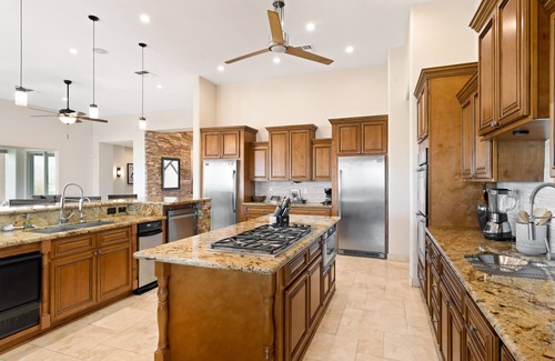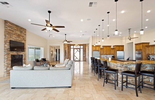 Unwind into vacation mode in the Great Room, detailed with a posh sectional, gas fireplace, and 55" TV. Marble flooring catches light from a gas fireplace, and picture windows overlook the desert and distant mountains. Curl up in the sun-soaked lounge or head to the pub for billiards, craft drinks, and watch multiple games on two TVs. Eight reclining leather seats await in a theater room; equipped with a poker table and a 120" projector screen equipped with Blu-ray, an Xbox.